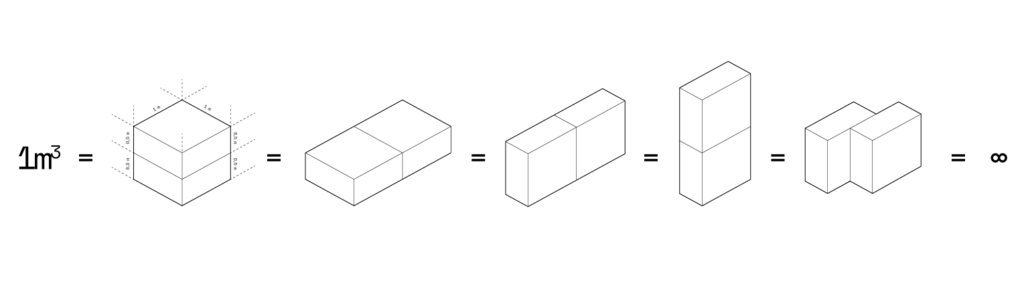 Le volume de 1 m³ est une contrainte de base qui peut prendre de nombreuses formes : cube, cylindre, assemblage modulaire, etc. C’est une invitation à explorer différentes interprétations et à laisser libre cours à votre créativité.