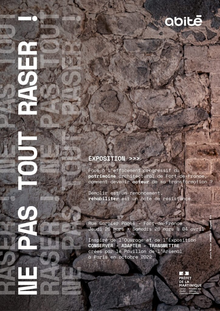 Inspirée de l’ouvrage et de l’exposition Conserver – Adapter – Transmettre du Pavillon de l’Arsenal (Paris, octobre 2022), l’exposition « NE PAS TOUT RASER ! » invite à réfléchir sur le rôle des architectes et acteurs de la construction face à la ville existante et à son patrimoine. Fort‑de‑France, capitale de la Martinique, concentre un patrimoine bâti riche mais négligé par les politiques. La ville est marquée par des démolitions et reconstructions successives, des mutations sociales et des adaptations à la géographie insulaire et au climat tropical.